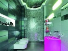 Изброените стилове могат да се считат за вече класика на жанра., има обаче и доста смели решения, взети във футуристичен стил, който най -често се среща в домовете на младите хора. Тук фантазията няма граници, решенията са най -неочаквани, до използването на плочки с абсолютно противоположни цветове и различни размери на един квадратен метър. В този случай е важно да знаете мярката, за да не превърнете банята или кухнята в стая за изтезания, където зрението и нервната система на човека ще претърпят тежък стрес..