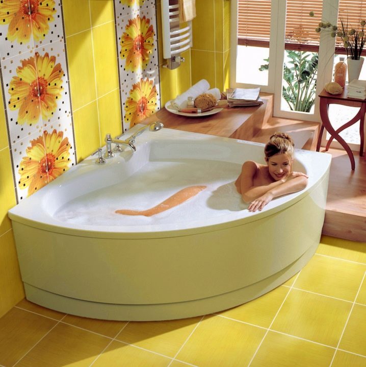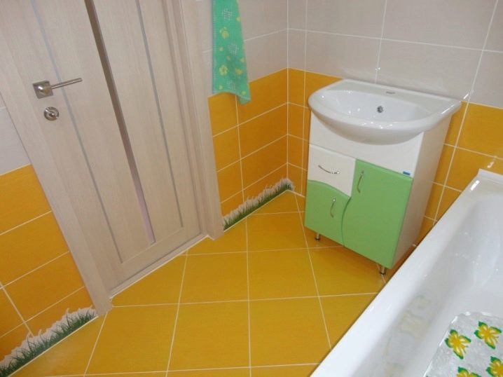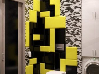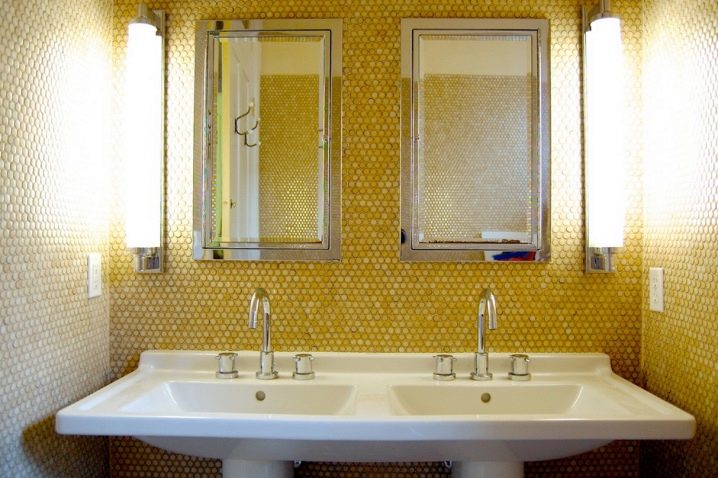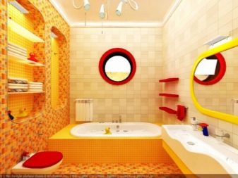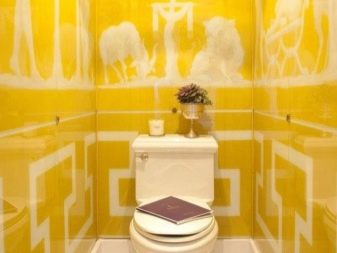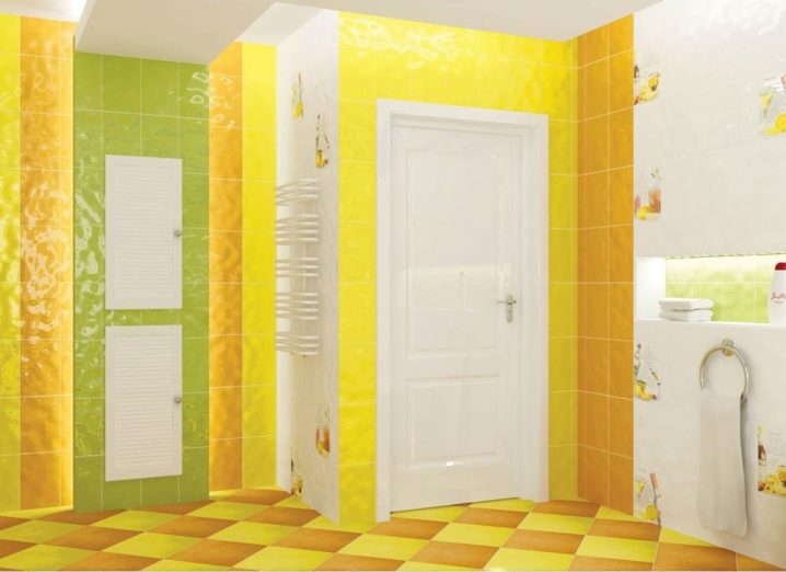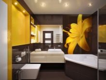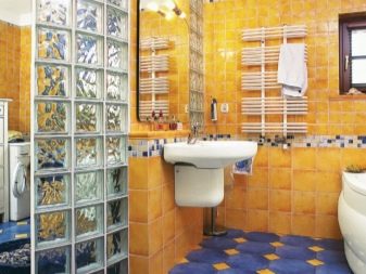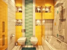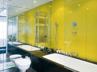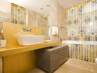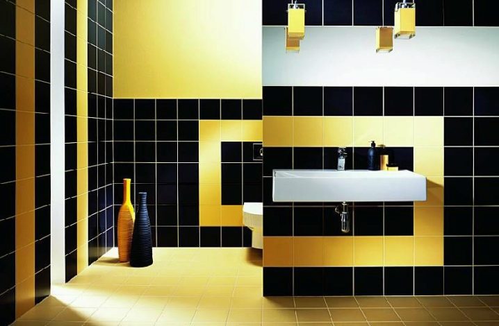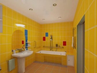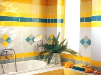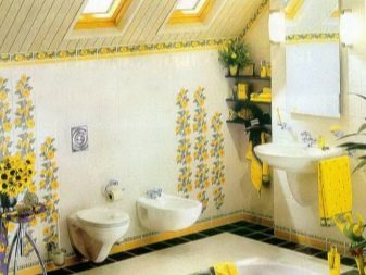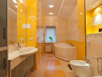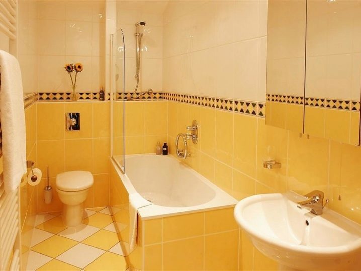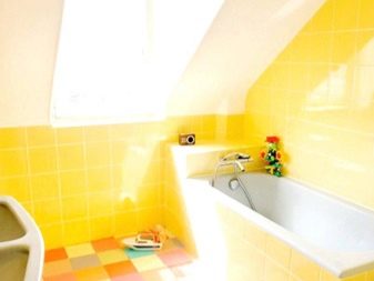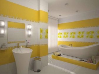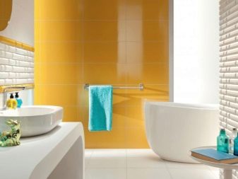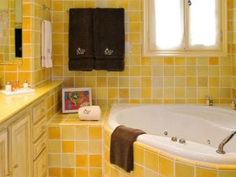 Препоръчва се използването на жълти плочки на големи площи: стени, подове, тавани. За малки бани се използват лъскави текстури, тъй като отразяващите повърхности създават илюзията за простор. По -малките стени в правоъгълна баня трябва да бъдат оформени със светли цветове.
