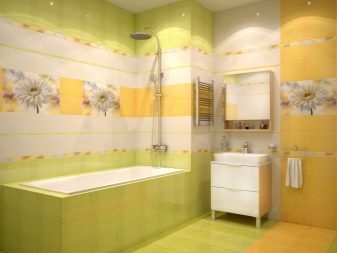 Светла баня. Жълтите плочки се комбинират със зелени в различни формати за полагане – стандартни по стените и диамант на пода.