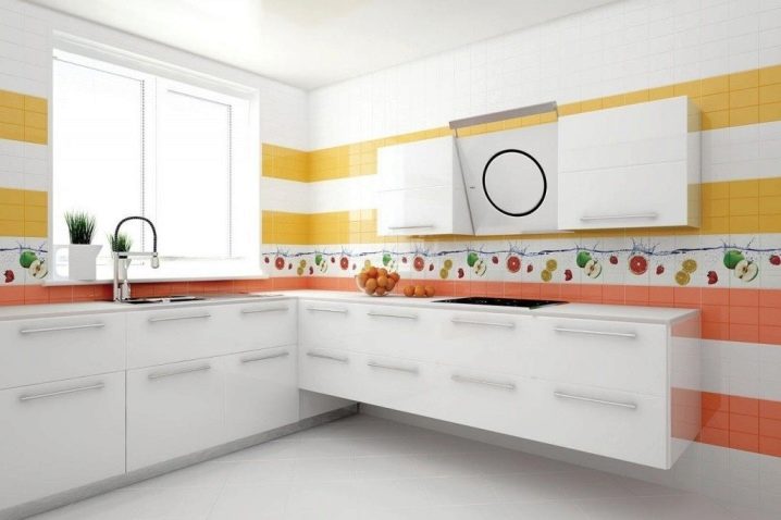 Просторна бяла кухня с ярки прасковени нюанси и жълти шарки.