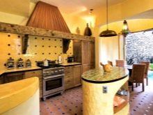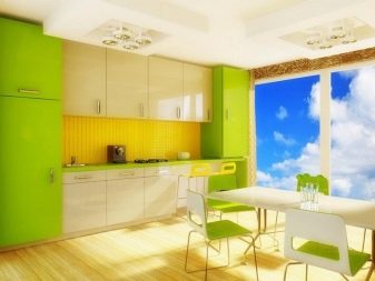 Точно както в банята, същият принцип важи и за кухнята. Този цвят е приложим за всеки интериорен стил. Но в кухнята основните повърхности са престилката и пода, по -рядко облицовката на цялата стена.