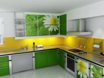 Ярка жълто-зелена кухня в стандартно оформление от квадратни плочки с малък формат.