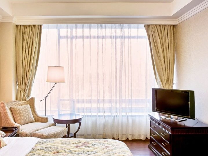Моля, обърнете внимание, че за закрепване както на завеси за вуали, така и на плътни завеси се използва корниз за гуми. Многоредовите прътови конструкции не са лесни за скриване под багета, а корнизът от корда не е в състояние да издържи тежестта на тежките завеси. Най -добре е да изберете тавански стойки, но за опънати тавани, ако има достатъчно място между отвора на прозореца и тавана, се използват стенни корнизи.
