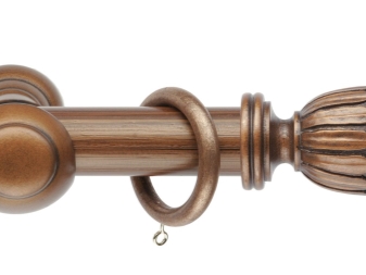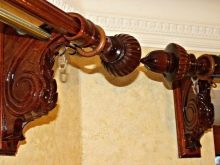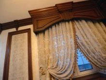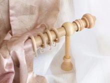 - здравина и издръжливост. Дървените изделия са много издръжливи и издържат натоварвания до 100 кг. Това качество ви позволява да използвате сложни ансамбли за декорация на прозорци, състоящи се от няколко вида материал. При спазване на режима на влажност и използването на допълнителни скоби с дълга дължина на пръта, такива корнизи ще издържат дълго време, няма да загубят формата си и ще запазят първоначалния си вид;