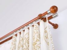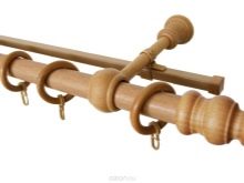 - Двоен ред – най -разпространеният дизайн на стрехи. Тя може да се състои от две дървени пръти с еднакъв размер, монтирани в един държач. Но по -често той е конструиран от главен дървен водач и допълнителна метална част, по -малка по размер и различна форма. Такива модели са предназначени за съвместно използване на тюл и завеси..