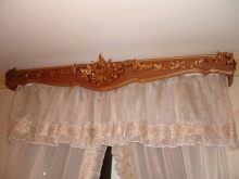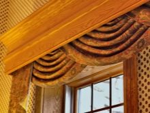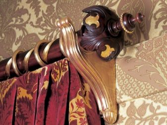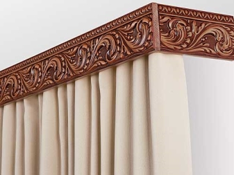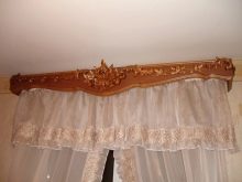 - франзела. Това е декоративна лента, която скрива механизма за закрепване на завесите и конструкцията на стрехите, която е инсталирана, за да увеличи декоративната привлекателност на продукта и да разнообрази дизайна. Багетите с различни размери и форми могат да бъдат инкрустирани с метални, стъклени и пластмасови вложки, което прави модела най -привлекателен, а масивни и издълбани ленти от махагон ще станат символ на лукс и просперитет. Дъбовите багети изглеждат много солидни и тържествени;