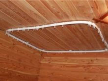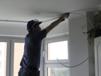 Инсталирането на тези конструкции е лесно да се извърши самостоятелно. Преди да извършите монтажните работи, е необходимо да подготвите мястото, към което ще бъде прикрепен корнизът (таванът трябва да е гладък и чист).