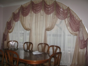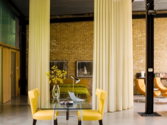 Опцията за отделяне на кухненската зона в студио апартаменти е много полезна, защото чрез затваряне на кухнята с плътен екран, можете да предотвратите разпространението на миризми, които възникват по време на готвене. За някои модели от този дизайн е възможно да издържат натоварвания от тъкани с всякаква плътност и маса, изборът в полза на гъвкави корнизи става очевиден.