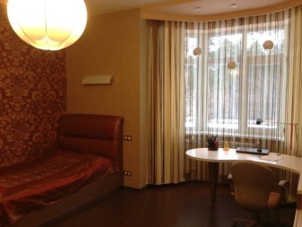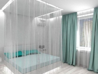 Поради светлите полупрозрачни завеси, окачени на корнизи, прикрепени към повърхността на самия таван, пространството на стаята изглежда по -отворено.