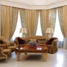 - Корниз от позлатена стена почти невидими под завесите, но малките проблясъци привличат вниманието към необичайния дизайн на тавана. Завесите, събрани с обикновена лента за завеси, не привличат вниманието към себе си. Златистият цвят на корниза не е избран случайно: той отеква светлината на фенерите през нощта, придавайки на стаята ореол на мистерия и мистерия.