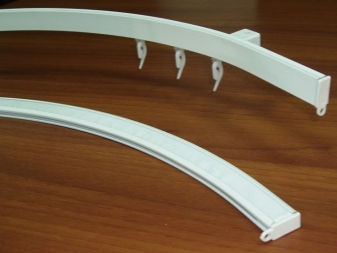 - Гъвкав корниз подходящ за кръгли еркери и в случаите, когато ъглите трябва да бъдат омекотени. Профилите се деформират първоначално, след което огънатите елементи се прикрепят към определеното им място; възможно е да се коригират завоите директно по време на монтажа. Най -често гъвкави модели се инсталират на тавана и служат само като стойка за завеси, след което са украсени с ламбрекени или бандо. Има и опции, оборудвани с лента с качулки (специални шарки на лентата, покриващи съединението на завеси и корниз). В този случай можем да говорим за естетическия компонент на модела..