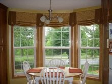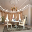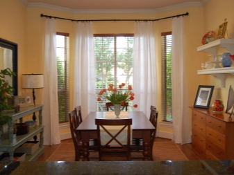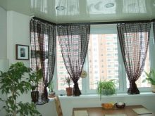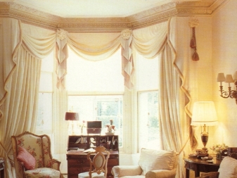 Като подчертаете еркера със специален корниз, ще се окаже, че създава уютна атмосфера в стаята. Изборът в полза на плътни тъкани за завеси ще предпази от течения и леко ще изглади липсата на отопление в тази част на къщата..