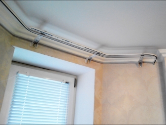 - Когато трябва да монтирате корниза в стената, като същевременно го оставяте възможно най -невидим, е по -добре да изберете корниз от корда. Изработен е от метален кабел, който е фиксиран със специални крепежни елементи и опънат. Такава струна е предназначена за голямо тегло, но елементите, които я усукват под голямо тегло, отслабват и корнизът може да се огъне.