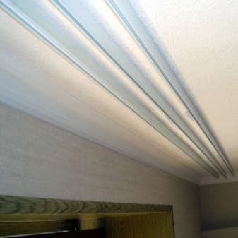 - Опциите за таван се монтират директно към тавана. Таванните конструкции могат визуално да увеличат височината на помещението, да го направят по -величествен. В комбинация с голямата ширина на корниза – от стена до стена – те създават наистина тържествена атмосфера в стаята. Таванните корнизи се монтират и в случаите, когато не е възможно да се фиксират стенните (например, ако материалът на стената е гипсокартон или разстоянието между тавана и отвора на прозореца е твърде малко). Опциите за таван са по -ниски от стенните по способността да издържат на голямо тегло на завесите, както и при избора на опции за монтаж на завеси (таванните модели, като правило, се инсталират само от два вида – автобусни и профилни).