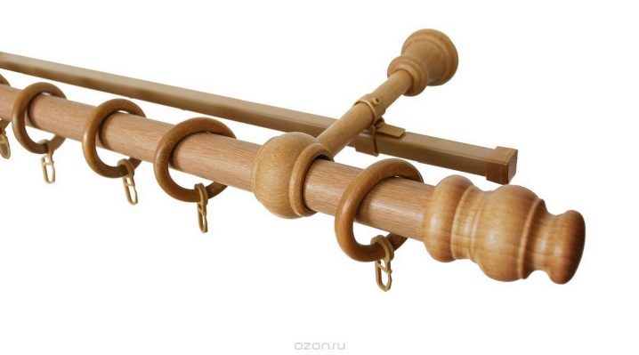 - Дървени корнизи – вечна класика, позволявайки на всяка стая да придаде царствен вид. Има както тръбни, така и багетни корнизи, изработени от дърво, и двата вида изглеждат страхотно. Трябва да бъдете внимателни, когато избирате корниз от дървена франзела. Дизайнът изглежда доста масивен и не е подходящ за декорация на прозорци в малка стая с нисък таван. Дървените модели сами по себе си са ярка декорация на стаята, така че трябва да планирате използването им дори на етапа на планиране на интериорния дизайн, за да ги впишете правилно в ситуацията в бъдеще. Дървените пердета са в състояние да издържат на доста голямо тегло (особено стенни модели). Те вървят добре с класически тежки завеси, изработени от плътни материи като брокат, жакард, гоблен, но също така могат да подобрят красотата на леките завеси..