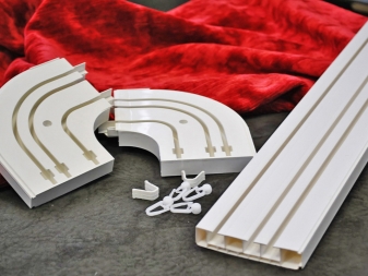 - Най -икономичният материал е пластмасата. Пластмасовите карнизи за завеси са доста търсени днес, особено таванските. Те не привличат вниманието към себе си, което ви позволява да поставяте акценти в стаята. Такива модели дори могат да бъдат скрити зад тавана, създавайки илюзията, че завесите не са прикрепени към нищо и просто плуват сами. Подобно решение е приложимо за прости, скромни интериори, но могат да се намерят и ярки решения..
