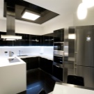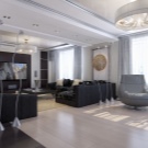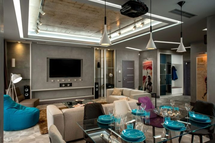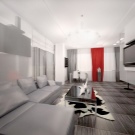- Много интересна комбинация от бяло, сиво и жълто. Стилен дизайн съчетава модерни и високотехнологични елементи (кухненски комплекти от метал и пластмаса, лъскави повърхности на шкафове, необичайни полилеи) и домашен комфорт (фоторамки, голям диван, мек хавлиен килим).