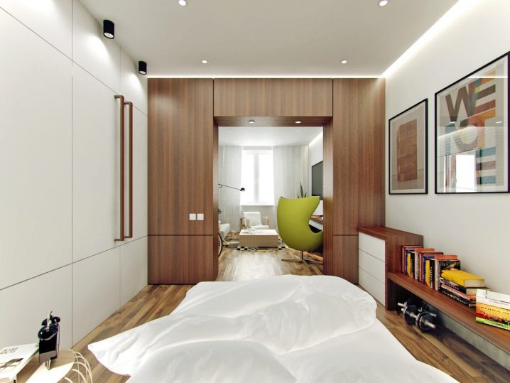 Зонирането на спалнята се извършва по различни начини: стена от мини гипсокартон, подвижен текстилен екран, гардероб и др..