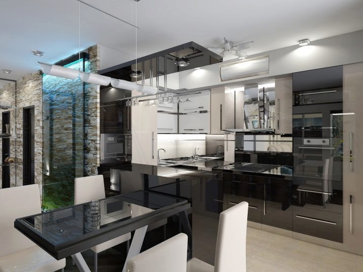 - Максимални черно -бели тонове, мек диван, преобладаване на естествено дърво в основата на мебели и оригинални стъклени полилеи.