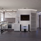 - Модерно и много удобно студио. Малкият интериор съчетава бели кухненски мебели с елементи от пластмаса, метал и камък. Гланцовият под и матовият таван също са в млечно бяло. Дървена маса за хранене, мек диван с възглавници и различни декоративни парчета под формата на рафтове, огледала за стена и рамки за снимки правят малък апартамент уютен..
