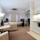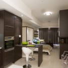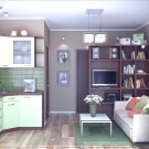 Самата концепция за студио апартамент предполага безплатно оформление на помещенията без ясно изразени прегради. Тук разделянето на зони е по -скоро произволно. Най -често срещаните зони са кухнята и холът. Ако площта на апартамента позволява, е възможно да се разпределят спалня и кабинет в нея..
