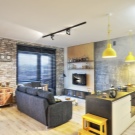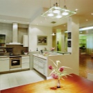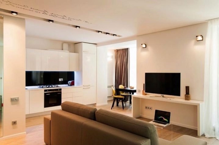 Ако това е млада двойка, която води активен начин на живот и се появява в апартамента само по -близо до нощта, може би кухненската зона трябва да бъде намалена, като я подчертае с халогенни лампи.