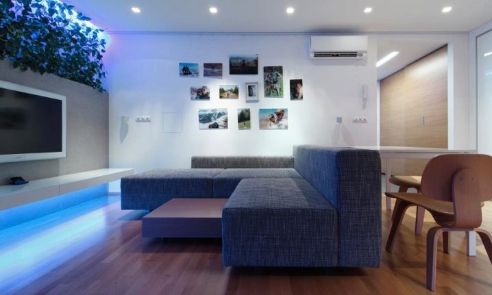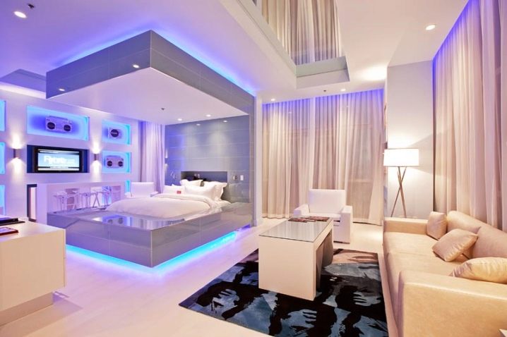 - Светодиоди. Те са много издръжливи, освен това не се нагряват и не са вредни за здравето. Светлинната мощност на такива устройства обаче е изключително ниска, така че няма нужда да се разглеждат като основен източник на светлина. В интериора на студиото те могат да играят ролята на нощна лампа или спомагателно осветление на отделни елементи. Тяхното слабо сияние може да облекчи стреса след тежък ден и да даде почивка на очите ви..