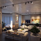 - Общо осветление. Полилей често се използва като основен източник. Допълнителни източници на светлина се осигуряват от таванни лампи, които могат да бъдат разположени по целия периметър на помещението или концентрирани в центъра на тавана. Осветителните тела, вградени в опънати тавани или окачени конструкции от гипсокартон, изглеждат много хубаво.