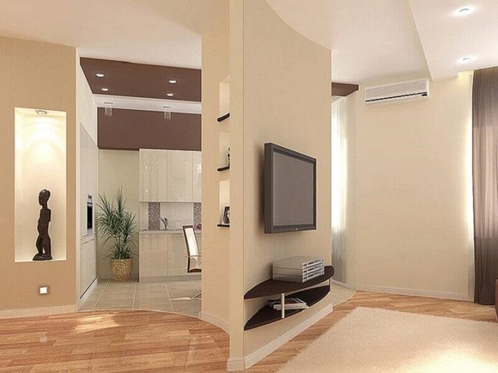 Можете също така да инсталирате преграда с арка в стаята, тя ще добави красота и лукс към вашия интериор. Покрай такава арка могат да се поставят красиви завеси. Най -добре е да разделите дневната и спалната зона на студиото по този начин. Има много необичайни опции за прегради -арки – това са подвижни прегради. Такива разделения могат да имат и класическа правоъгълна форма..