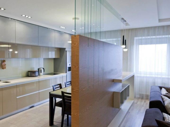 За производството на плъзгащи се прегради най -често се използва комбинация от дърво и стъкло. В допълнение, такава преграда може да бъде украсена с огледало, което ще направи интериора на апартамента по -шикозен и в същото време визуално ще разшири пространството на студиото..