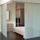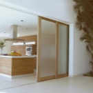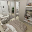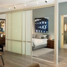 Интересен вариант би бил инсталирането на преграда под формата на плъзгащи се плъзгащи се врати, които могат да бъдат украсени с изображения или шарки по ваш избор. Такива врати се отварят почти безшумно, тъй като се движат на колела по специални релси. Такова зониране дори ще ви позволи да създадете отделна стая в студиото си..