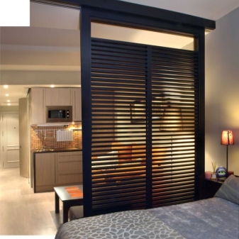 Много интересен вариант е да се използват прегради за зониране, които при отваряне се сгъват в акордеон. Ако разкриете напълно такива "врати", след това освободете максимално студийното пространство и го спестете. Това е голямо предимство на вратата на акордеон пред конвенционалната врата на отделението. Те много удобно зонират стаята и заемат минимално пространство, като същевременно декорират интериора. Дизайнерите украсяват такава плъзгаща се преграда под формата на акордеон със златни и сребърни нишки, ажурен модел или интересни изображения.