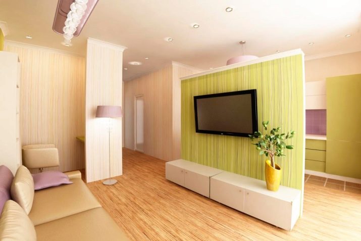В допълнение, за стилно и оригинално зониране с разнообразни прегради е по -добре да използвате различни материали и техните цветове за стени и подове в различни зони, най -добре е тези материали да се различават по своята текстура. Ако можете умело да разграничите всички функционални зони в интериора на малко студио, ще ви бъде много лесно да създадете уютна атмосфера в къщата, ще можете да срещнете гости и в същото време спалнята или кухнята ще бъдат отделени и скрити от любопитни очи..