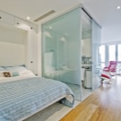 Стъклената преграда ще изглежда много красива и елегантна във всеки интериор на студио апартамент и можете да изберете или матово, или велпапе, или напълно прозрачно. Производителите предлагат огромен избор от такива прегради с голямо разнообразие от дизайни. Сред собствениците на студийни апартаменти зонирането с помощта на стъклени прегради е много популярно, тъй като стъклото позволява на светлинните лъчи да проникват и по този начин прави стаята по -светла. Благодарение на такава преграда, меката разсеяна светлина ще проникне в стаята, което ще направи стаята визуално по -просторна..