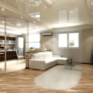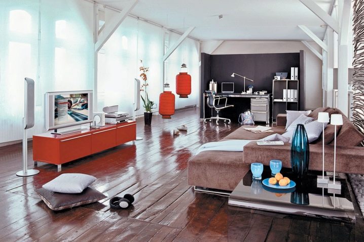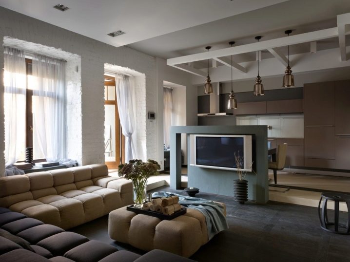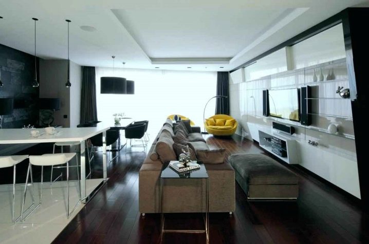 Много интересно решение би било оформление, използващо мебели, които съставляват един единствен ансамбъл. Картината изглежда страхотно, когато всяка мебел плавно се влива в друга. Изглежда много стилно и хармонично. В същото време е важно геометрично правилно да подредите мебели в голям студиен апартамент..