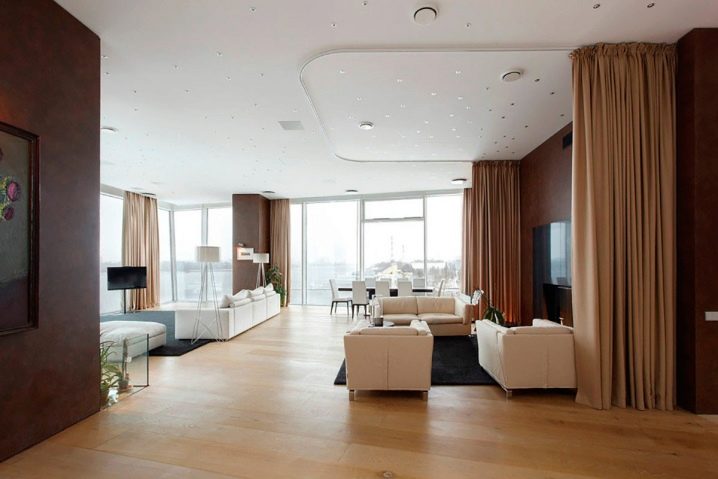 Има огромен брой опции за зониране. За да направите това, можете самостоятелно да инсталирате прегради, мебели, шкафове, рафтове с домакински уреди, бар плотове. Зонирането с осветление и цвят сега е много популярно, както и зонирането чрез създаване на таван и под на две нива.