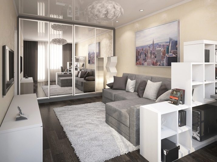 При първоначалното планиране на студио апартамент трябва да се отървете от складови помещения, ако имате такива, тъй като по този начин можете допълнително да разширите пространството на студиото си. За удобно поставяне на нещата, когато планирате такъв апартамент, осигурете място за местоположението на гардероба. Това е много просторна и удобна мебел, която благодарение на компактния дизайн на вратите, които не се отварят навън, ще заема много малко място. По -добре е да го поставите в ъгъла на стаята. Ако изберете гардероб с огледални врати за студиото си, можете визуално да увеличите площта на апартамента си.