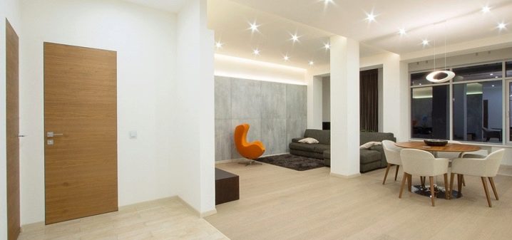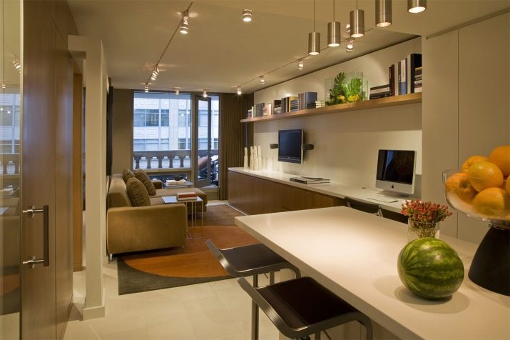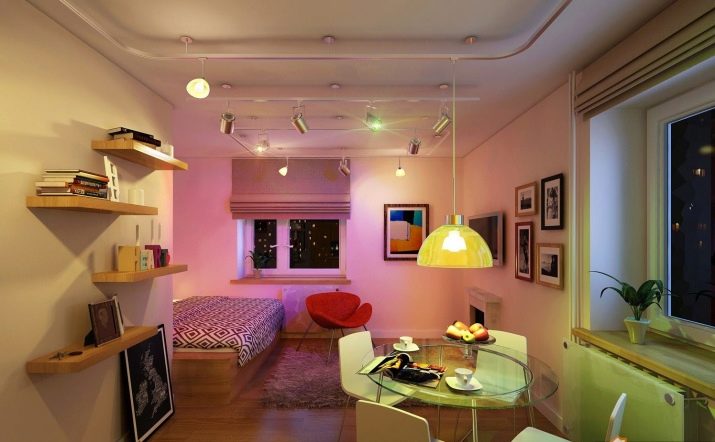 За стая с различни функционални зони най -подходящи са вградените прожектори, които са най -добре разположени по стените. Важно е да се вземе предвид колко далеч е всяка функционална зона от прозореца, колкото по -близо е зоната до прозореца, толкова по -ярко трябва да блестят устройствата. Ако планираната зона ще бъде разположена срещу прозореца, тогава трябва да я осветите допълнително с флуоресцентни лампи.