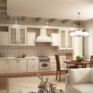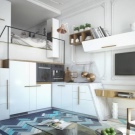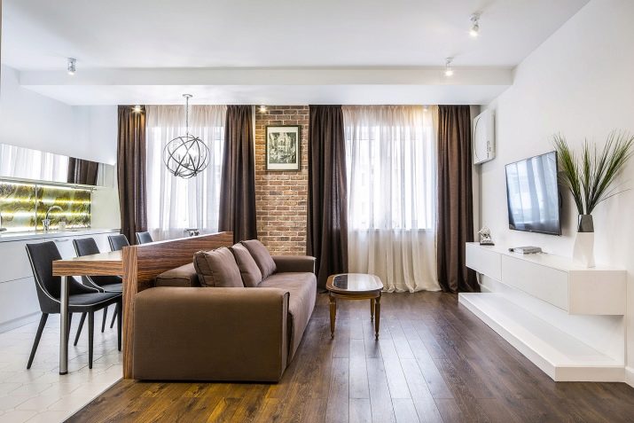 Най-популярният вариант за декориране на кухня в такова студио е създаването на кухня-хол. Тази опция е идеална за средно студио с площ от 44-45 кв. м и повече, защото в такъв апартамент можете да направите по -просторна всекидневна за уютни семейни събирания или за среща с гости. В този случай кухнята-холът ще включва поне две зони: зона за гости (зала) и кухненска част, в която ще готвите. Друг вариант са цели три зони: работната зона на кухнята, трапезарията и зоната за гости..