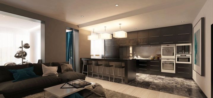 Със съвместния дизайн на кухнята и хола се оказва, че една функционална зона логически продължава от друга зона, тоест кухнята плавно преминава в хола. В същото време такава кухня-хол е проектирана в същия стил и в същата цветова палитра. Можете да инсталирате необходимата електроника в такава кухня, като телевизор, аудио устройства и други. Вградените уреди са най-подходящи за кухня-хол, тъй като заемат по-малко място и в същото време изглеждат много модерни и модерни. Тази техника дори помага да се направи стаята по -удобна..