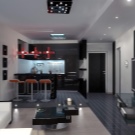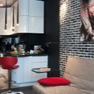 Ако все пак искате да разделите кухнята и хола, тогава най -подходящото и стилно решение за планиране за вас би било да инсталирате бар брояч. Той ще служи като добра линия между тези части на студиото. Това е много стилна и функционална мебел. Малко семейство може да вечеря на такъв гише, ако решите да не правите отделна зона за хранене, това ще ви спести от необходимостта да купувате голяма маса за хранене. Освен това ще имате повече място за подреждане на други функционални зони..