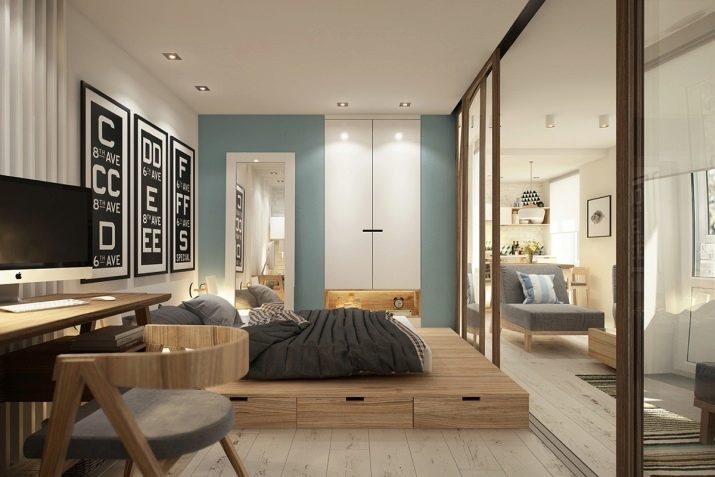 С такова оформление живата част на студиото заема много по -малко място от частта за гости, но изглежда по -удобна, а частта за гости става по -удобна. Може да се използва като зона за отдих. Няма действително разделяне във всяка от тези две части на студиото. Можете да ги ограничите малко с контрастен цвят или различни декоративни елементи..