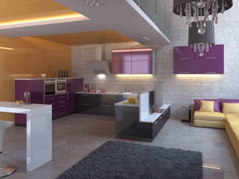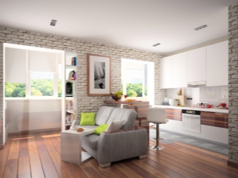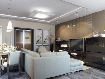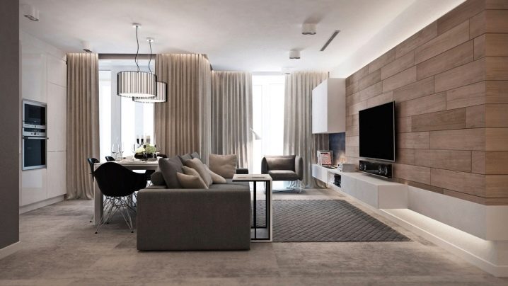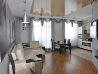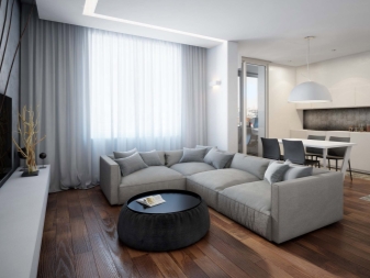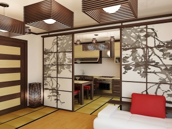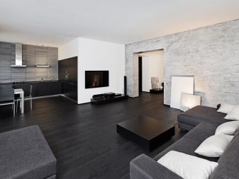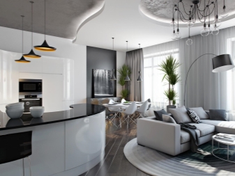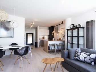 Такъв интериор не търпи ексцесии. Като декор могат да се използват необичайни лампи или стойки, които в допълнение към декоративната функция изпълняват полезна. Пространството е разделено на зони с помощта на мебели или слушалки. В този случай на прозорците се използват завеси.