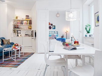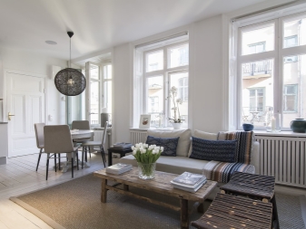 Може би най -популярният вариант за дизайн на малки апартаменти. Скандинавският интериор е доминиран от пастелни цветове, докато ярките цветови акценти под формата на мебели или декоративни елементи добавят разнообразие към обкръжаващата атмосфера.. Завесите на прозорците се заменят с римски щори или щори, което придава на стаята специален цвят.