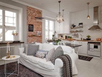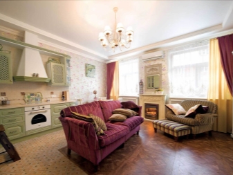 В такъв интериор камина и свежи цветя, ръчно изработени декорации и лампи под формата на подови лампи изглеждат добре. В този случай можете да зонирате пространството с помощта на довършителни елементи. Можете да украсите пространството с реставрирани стари мебели – то ще се впише в стила на стаята просто перфектно.