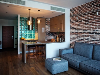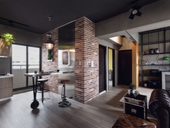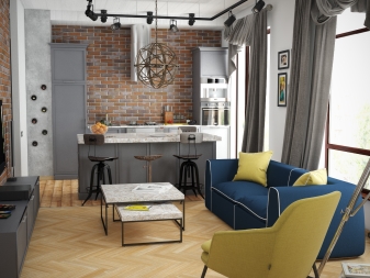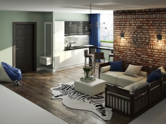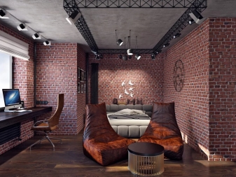 Всички интериорни детайли са инсталирани, за да създадат атмосфера на уют и комфорт. Пространството е визуално разделено на зони с помощта на декоративни арки и тухлени опори. Леглата се монтират далеч от стените, въпреки че са възможни и други опции. Шкафовете винаги са просторни, но малки, а масите и креслата са подвижни – на колела.