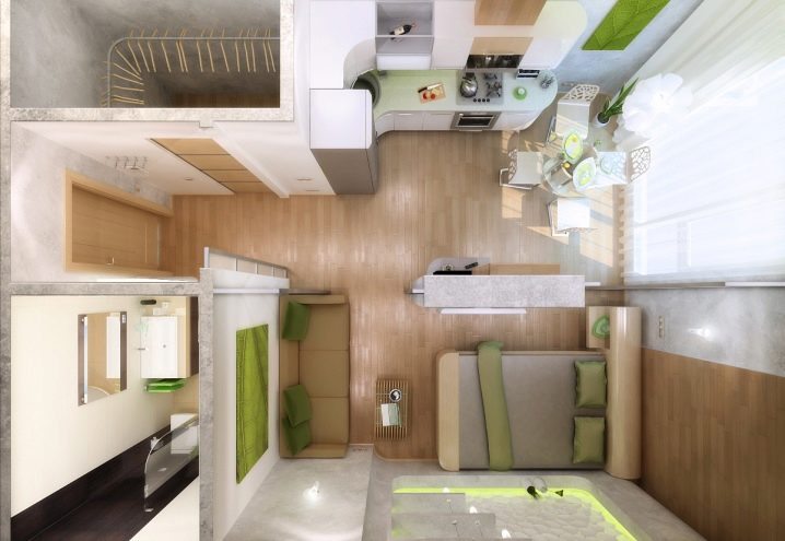 Специално внимание трябва да се обърне на зонирането на пространството. По -добре е да разпределите най -малките зони към банята и коридора и да разделите по -голямата зона между хола, спалнята и кухнята.