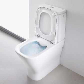 Дренажната система обикновено е представена от компактен системен резервоар.. Той не е много икономичен по отношение на консумацията на вода, но е лесен за инсталиране и поддръжка. Струва си да се има предвид, че тоалетните без рамки в този дизайн не се срещат твърде често, като постепенно отстъпват на висящите модели. Подовите версии могат да бъдат оборудвани с наклонен изход, както и с допълнителни опции под формата на сензори за движение, отделения с аромати за източване, почистване и освежаване на течности за дезинфекция.