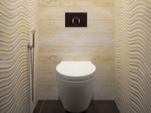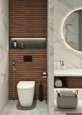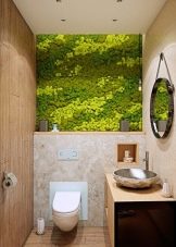 - Екостил. Характеристика – естествени материали. Тоалетната е завършена с дървена ламперия или плочки от изкуствен камък. Също така, дизайнерите използват цветни аранжировки..