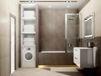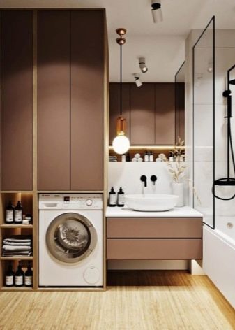 В просторна баня от комбиниран тип е по -целесъобразно да инсталирате пералнята на пода. Въз основа на стила на интериора и оформлението, той може да бъде вграден в комплект мебели, под мивка, в стена или килер. Ако мястото е малко, можете да премахнете мивката или да поставите мивката над пералнята. В този случай е препоръчително да инсталирате оборудването по такъв начин, че проводниците и маркучите да са по -малко забележими..